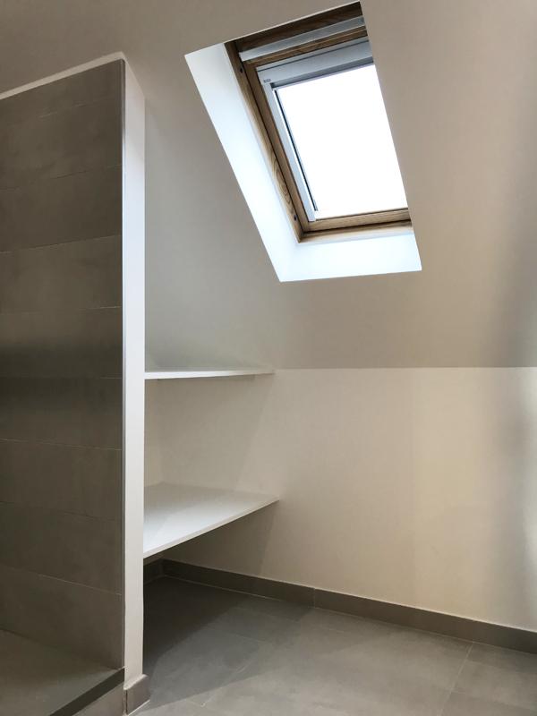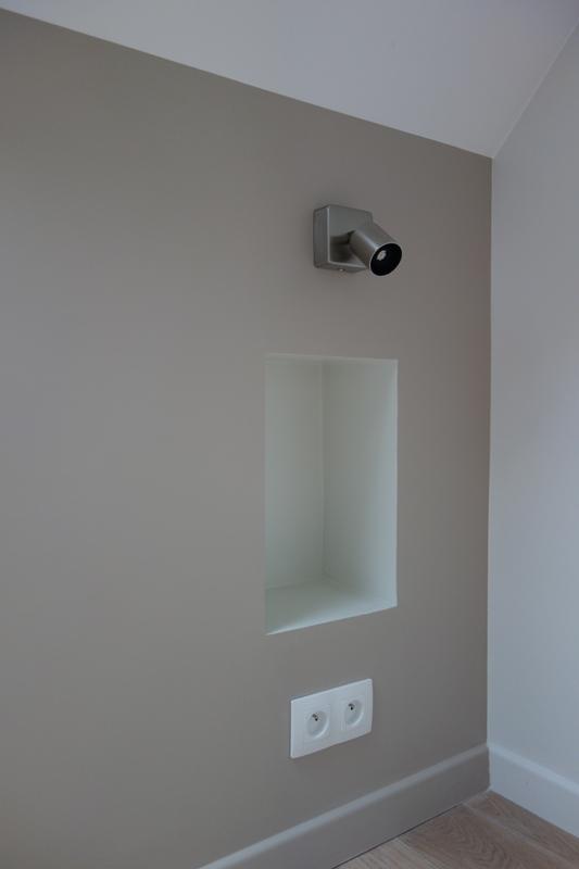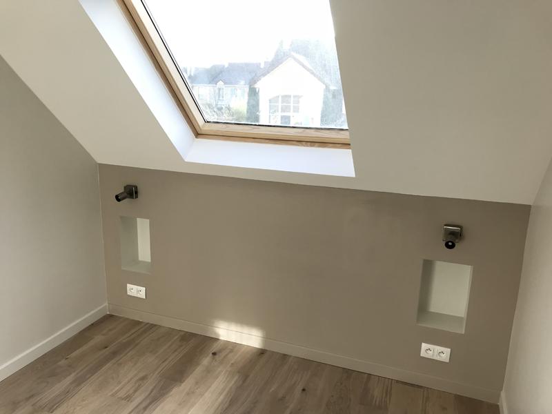 Le scénario retenu parmi nos deux propositions a consisté à réaliser une chambre, un dressing et une salle de douche en impactant uniquement la chambre mitoyenne pour la réalisation du dressing en L. La création de niches au niveau de la tête de lit et dans la douche a permis d’optimiser le moindre espace et limiter le mobilier.