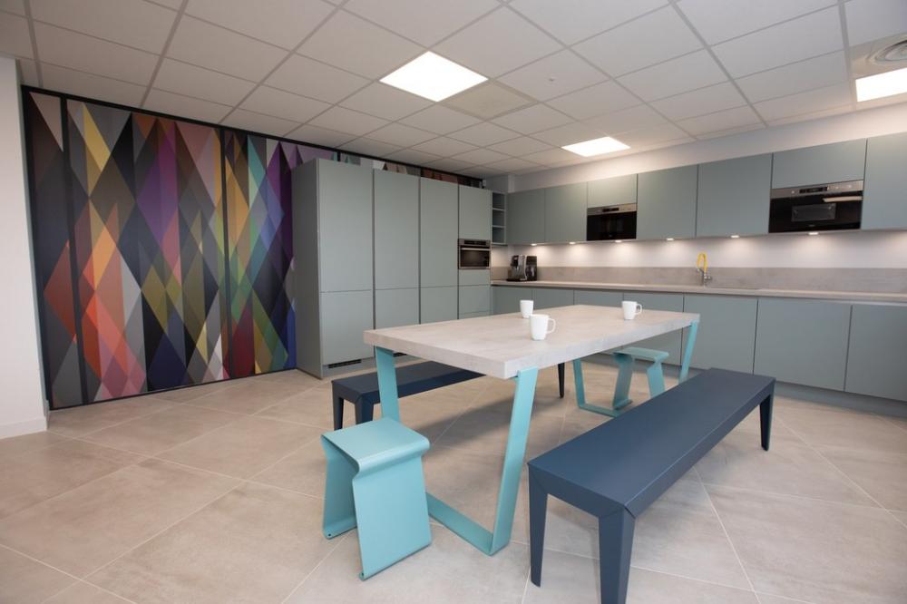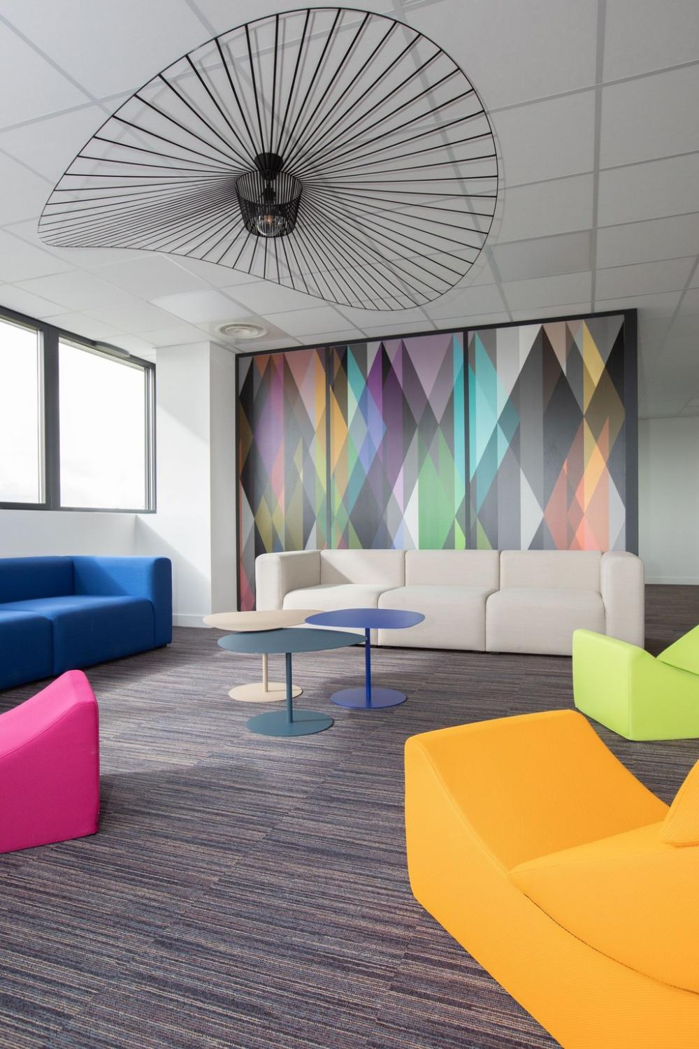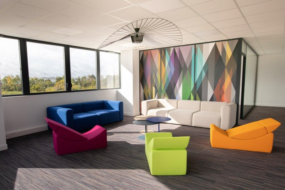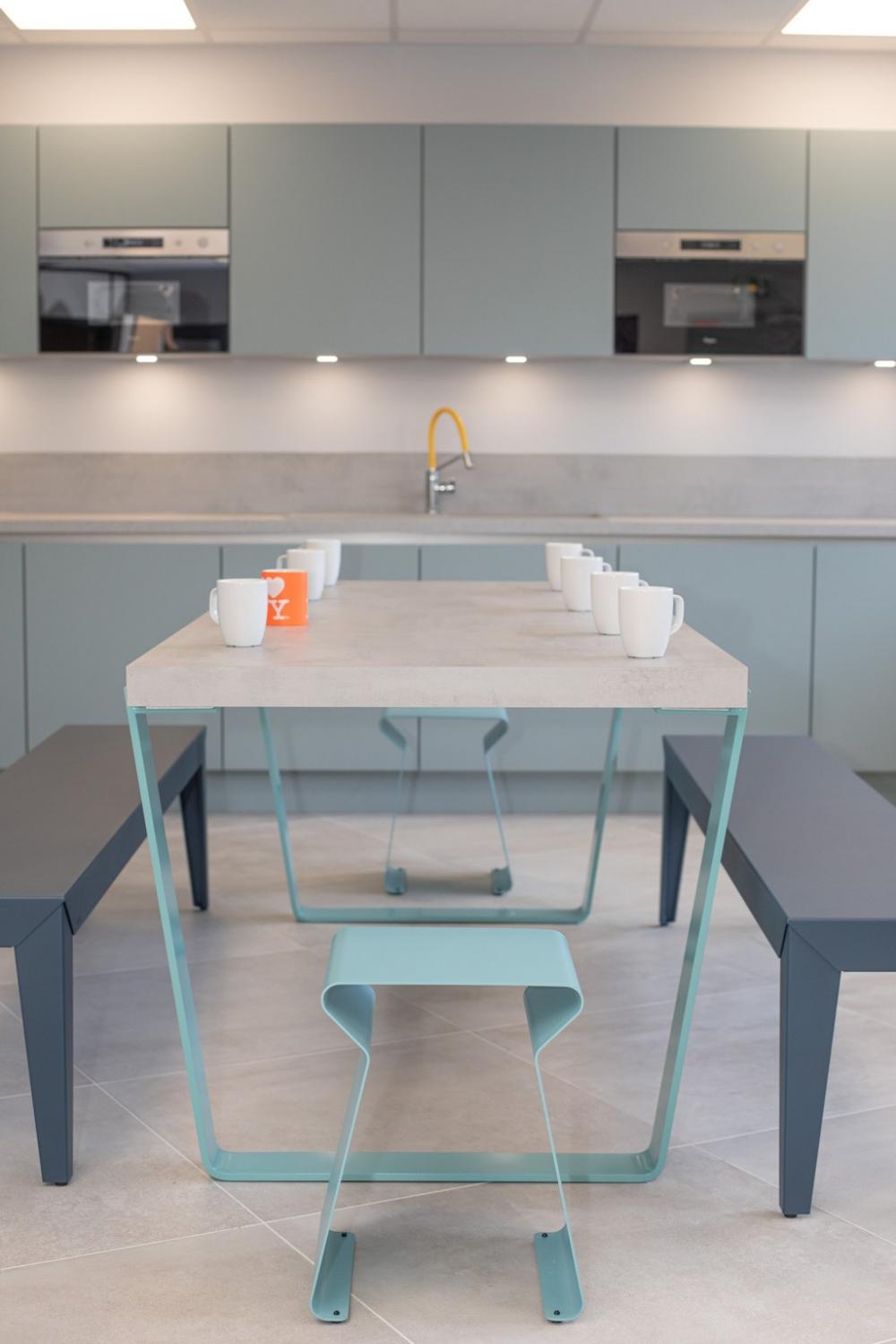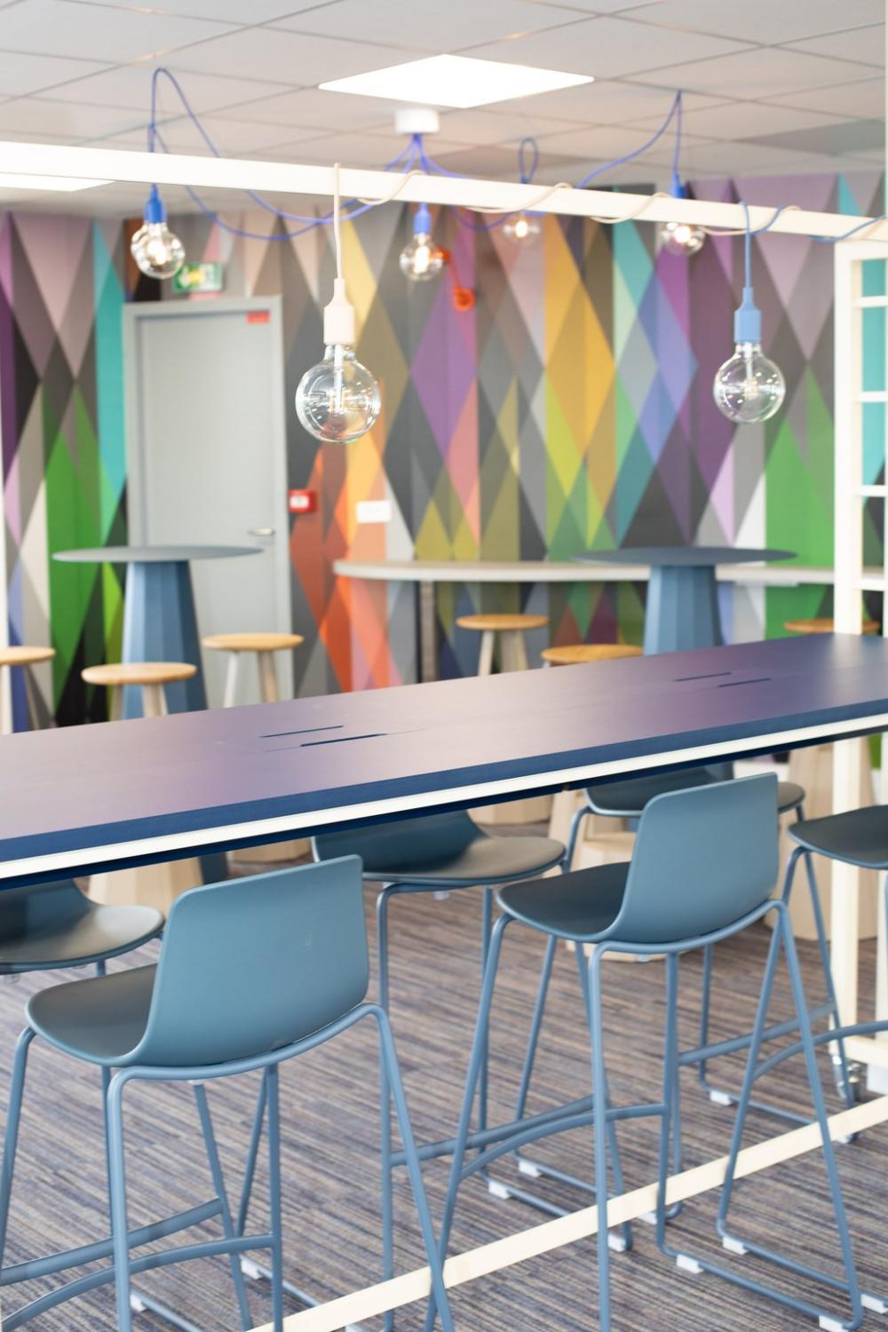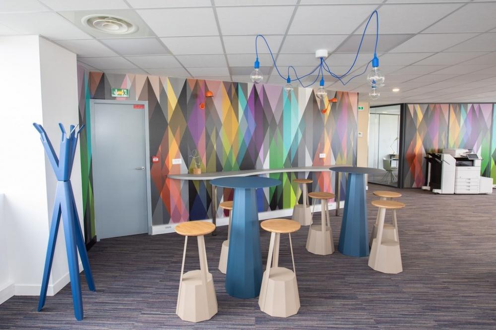 Nous nous sommes ensuite occupés de créer une ambiance colorée et ludique, propice à travailler dans la bonne humeur, avec un mobilier aux couleurs douces et acidulées. Aucun détail n’a été laissé au hasard pour que notre client bénéficie d’une ambiance différenciatrice et originale, vecteur d’une identité dynamique.